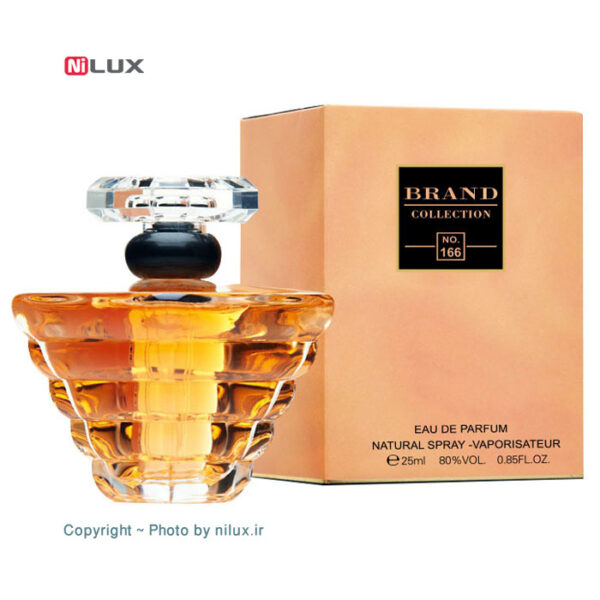 عطر مینیاتوری زنانه برند کالکشن شماره No.166 فرم کوچک شده عطر زنانه لانکوم مدل Tresor است که در حجم ۲۵ میلی متری تولید و به بازار عرضه شده است. عطر مینیاتوری زنانه برند کالکشن شماره No.166 در ابتدا با رایحه هلو، آناناس، ترنج، شکوفه زردآلو و یاس آغاز می شود در نت میانی به رایحه یاس، رز و زنبق می رسد و در انتها به رایحه وانیل، مشک، عنبر و چوب صندل ختم می شود. این ادو پرفیوم با رایحه تلخی که دارد برای استفاده در مهمانی های شبانه پیشنهاد مناسبی ست.